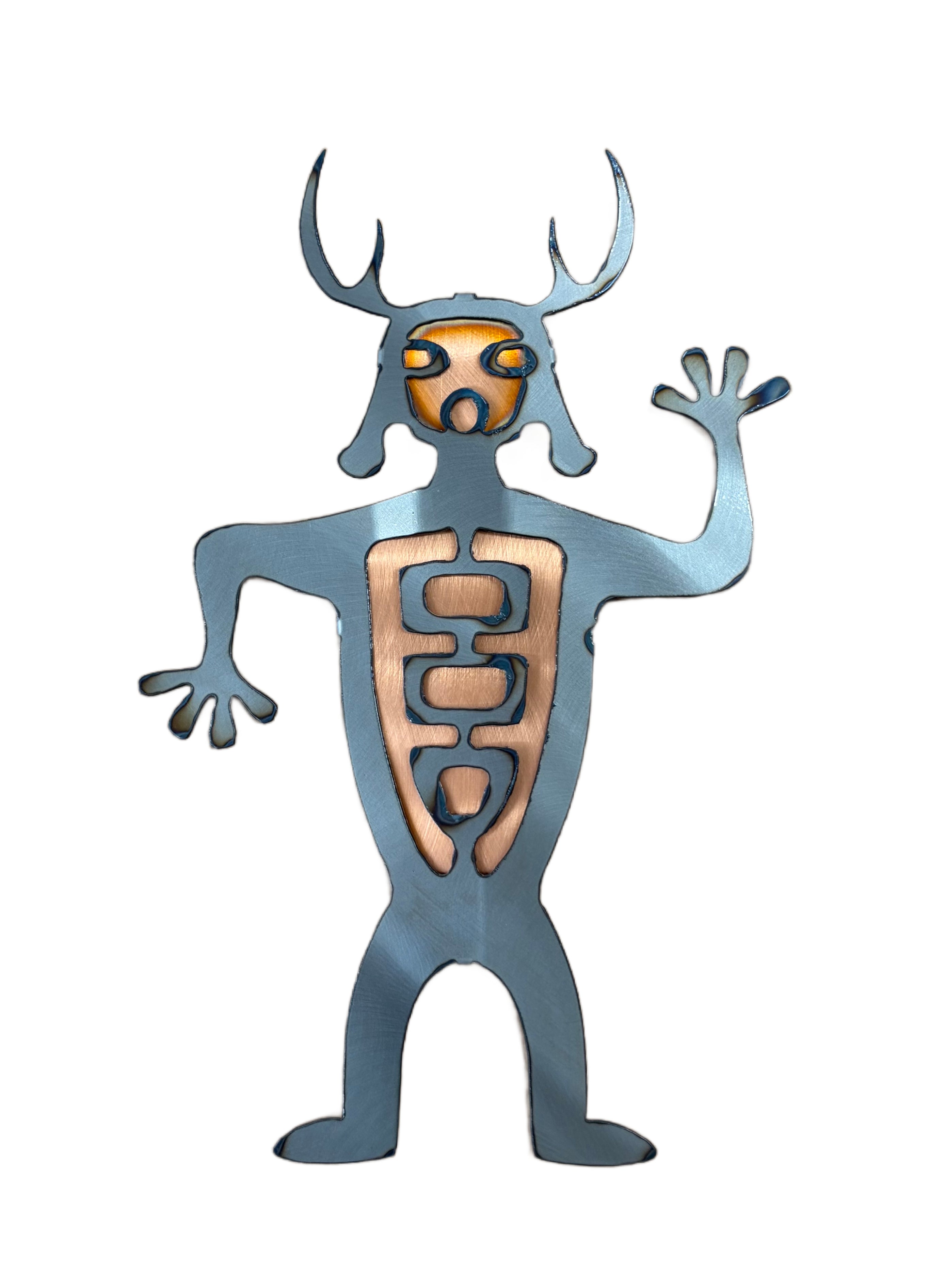 While the true meaning of many petroglyphs are passed down through oral traditions within specific tribes, our interpretation of the Deer Man petroglyph signifies a spirit guide that is believed to be half human and half deer. It is the protector of the forest. Choose from either our raw copper finish, our fiery torched flame finish or our stunning patina blue finish.