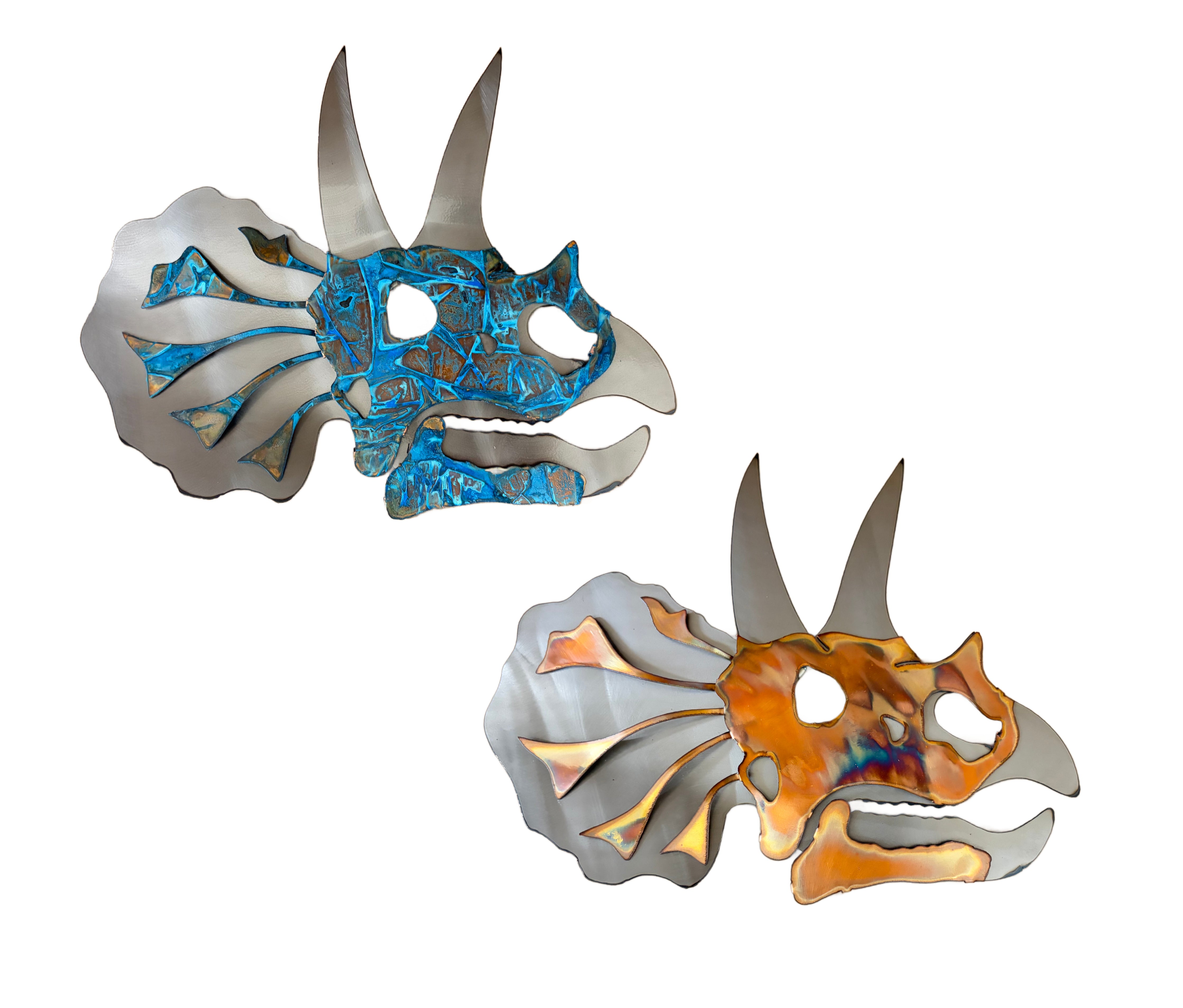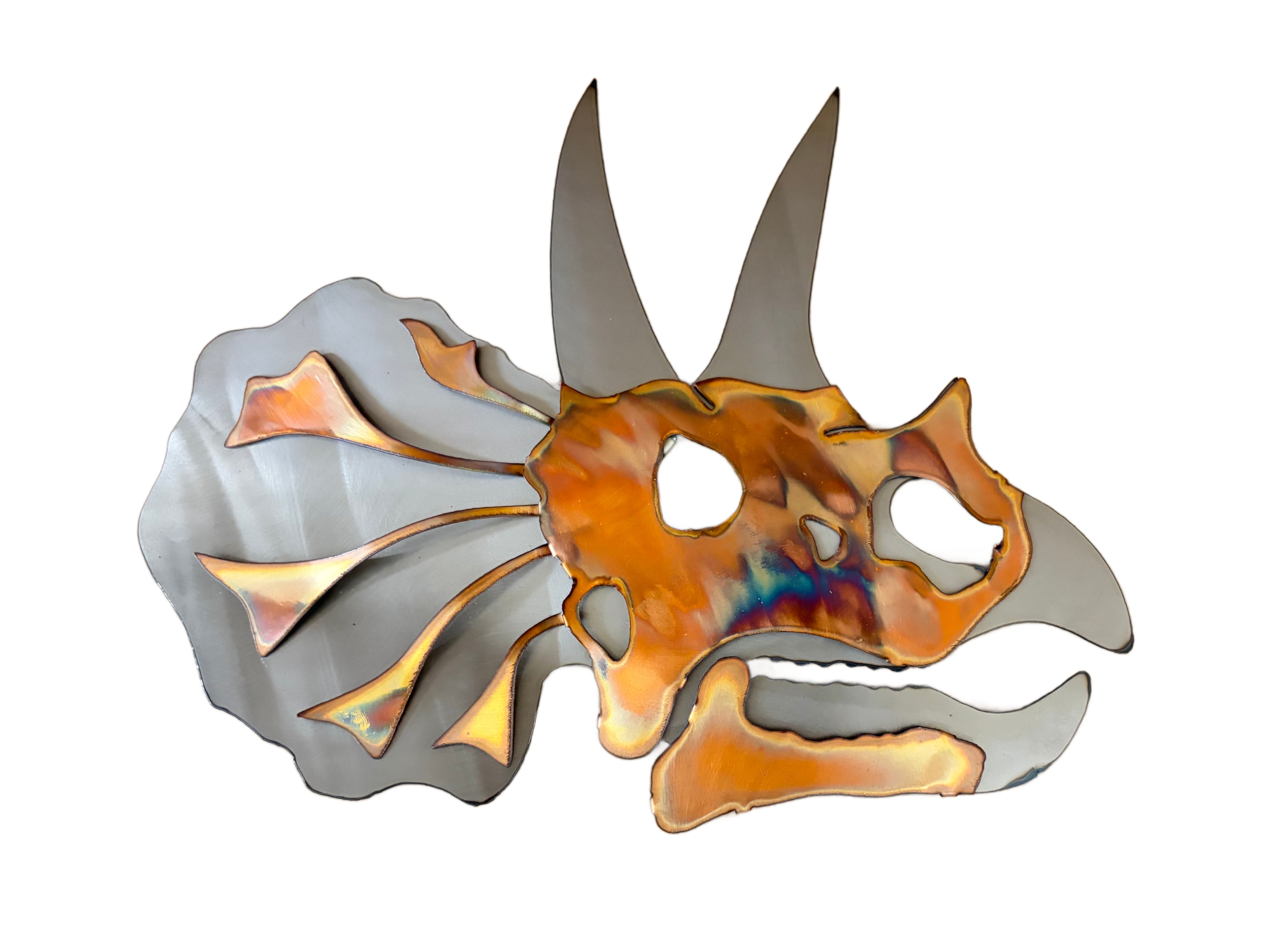 Add some prehistoric flair to your home with our Triceratops skull wall hanging. This unique piece features our take on a Triceratops skull. From the Cretaceous period, this guy is crafted from copper and steel for a durable and eye-catching display. A must-have for any dinosaur fan!